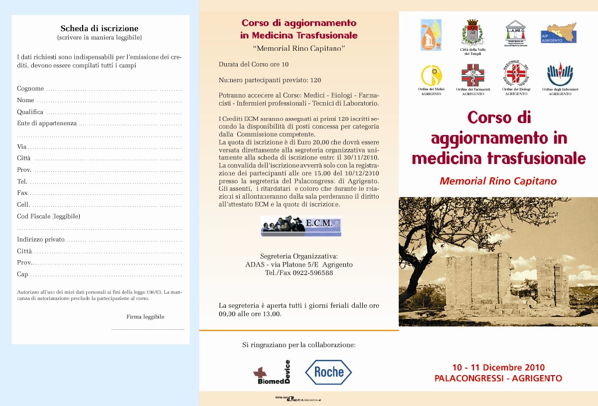 I prossimi 10 ed 11 dicembre, presso il Palacongressi di Agrigento, si svolgerà il Corso di aggiornamento in medicina trasfusionale “Memorial Rino Capitano”. Organizzato dall’ADAS Agrigento, il corso è riservato a medici, biologi, farmacisti, infermieri professionali e tecnici di laboratorio. 120 il numero massimo di partecipanti, i quali potranno usufruire dei crediti ECM.