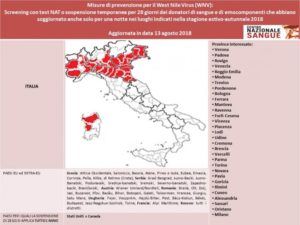 Per quanto sopra, con riferimento alla nota del Centro nazionale sangue prot. n. 1251.CN5.2018 del 6 giugno 2018, si raccomanda di utilizzare it test WNV NAT quale alternativa al provvedimento di sospensione temporanea per 28 giorni dei donatori che hanno trascorso almeno una notte nelle aree interessate.