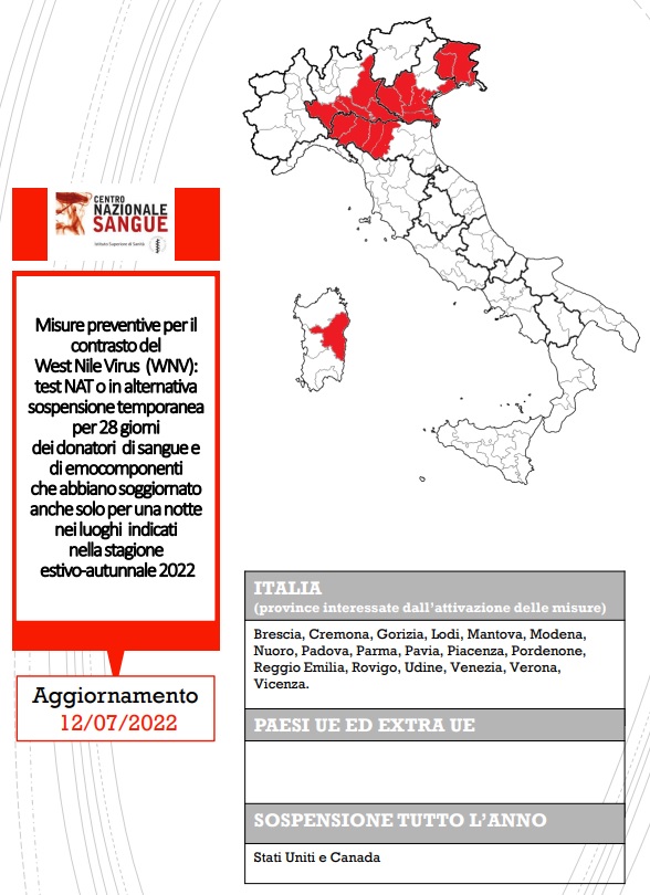 Con riferimento alla circolare del Centro Nazionale Prot. n.2022_0019130 “Indicazioni per la sorveglianza e la prevenzione della trasmissione del West Nile Virus e Usutu mediante la trasfusione di emocomponenti labili nella stagione estivo-autunnale 2021” del 17 maggio 2022, il CNS raccomanda di utilizzare il test WNV NAT quale alternativa al provvedimento di sospensione temporanea per 28 giorni dei donatori che abbiano trascorso almeno una notte nelle aree interessate.