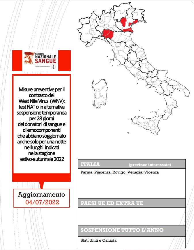 Con riferimento alla circolare del Centro Nazionale Prot. n.2022_0019130 “Indicazioni per la sorveglianza e la prevenzione della trasmissione del West Nile Virus e Usutu mediante la trasfusione di emocomponenti labili nella stagione estivo-autunnale 2021” del 17 maggio 2022, il CNS raccomanda di utilizzare il test WNV NAT quale alternativa al provvedimento di sospensione temporanea per 28 giorni dei donatori che abbiano trascorso almeno una notte nell’area interessata.